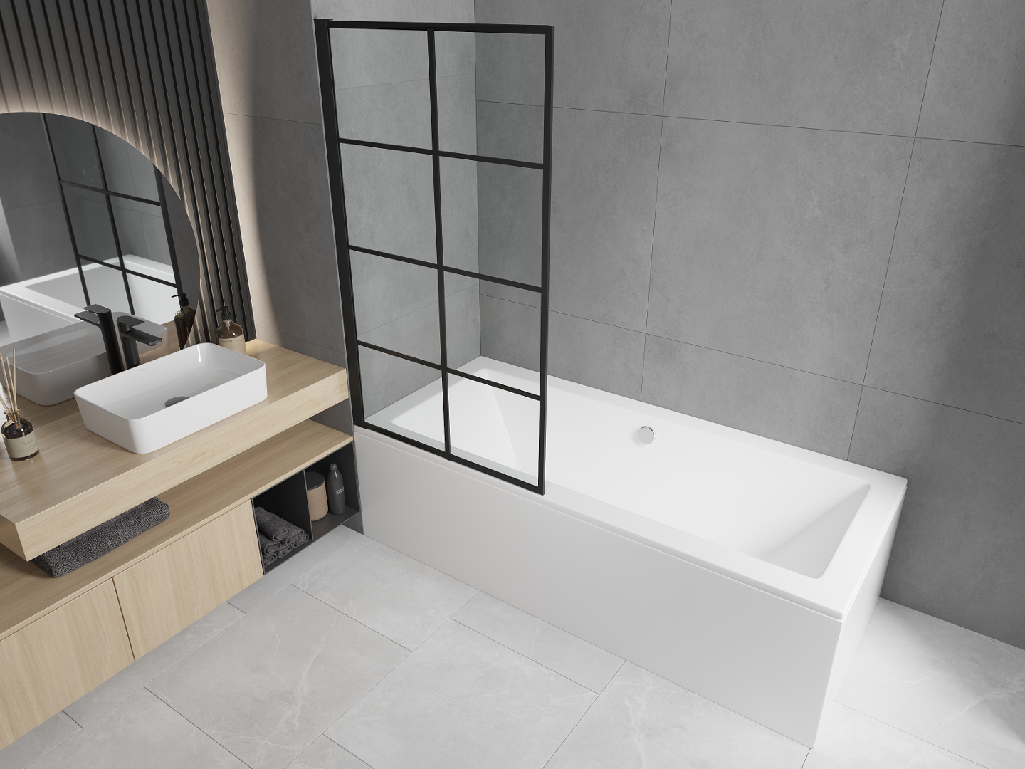 Parawan posiada jedno ruchome skrzydło z możliwością złożenia. Takie rozwiązanie pozwala zaoszczędzić więcej miejsca w łazience i umożliwia swobodne korzystanie z pozostałej przestrzeni, gdy nie korzystamy ze strefy kąpielowej.