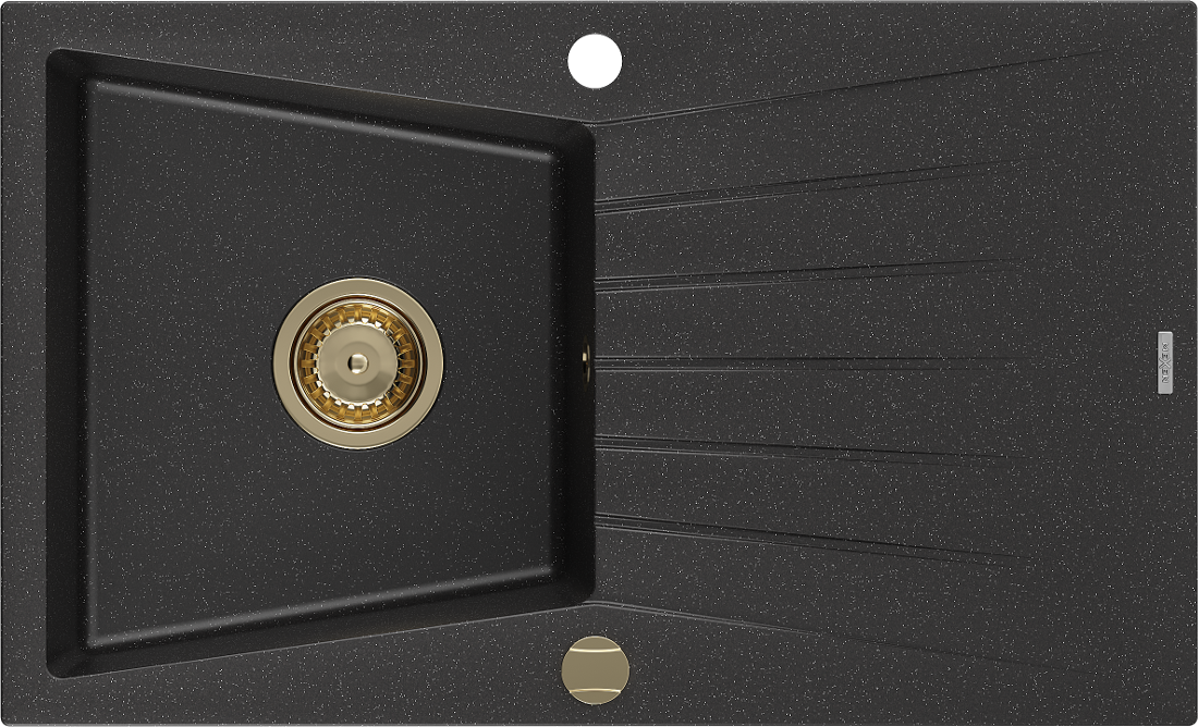 Mexen Cesar zlewozmywak granitowy 1-komorowy z ociekaczem 775 x 470 mm, czarny/srebrny metalik, syfon złoty - 6514771010-73-G
