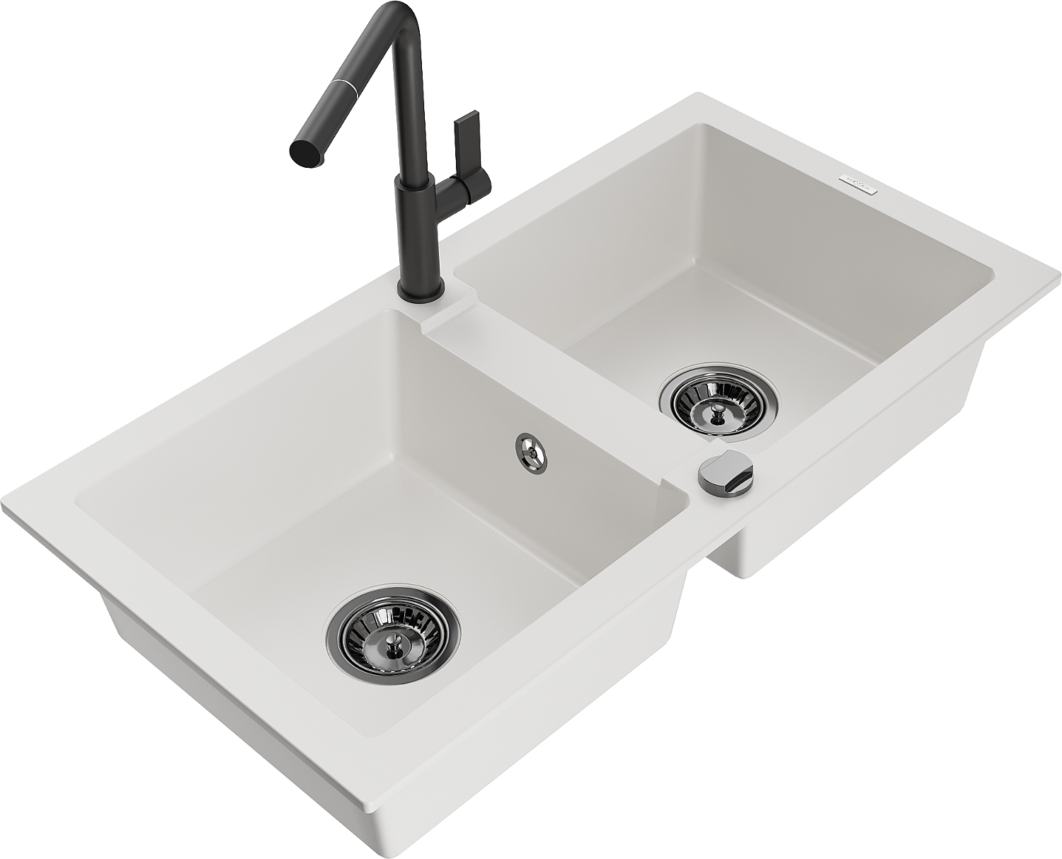 Mexen Mario zlewozmywak granitowy 2-komorowy z baterią kuchenną Flora, biały - 6504-20-670401-70-B