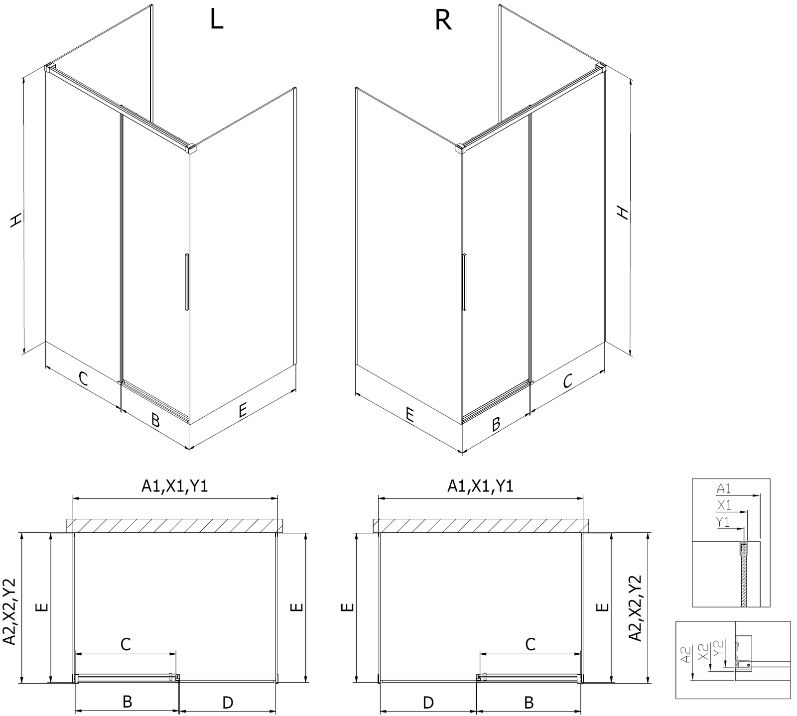 W przypadku drzwi przesuwnych, jeżeli kabina otwiera się na prawo, to mamy do czynienia z wariantem prawostronnym, jeśli na lewo to z lewostronnym.